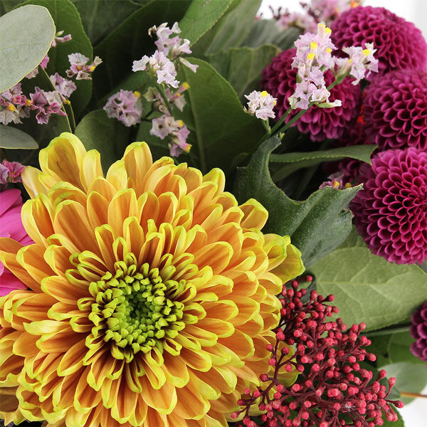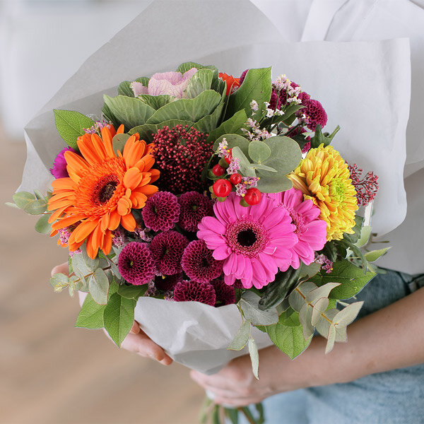 Bouquet rond dans les tons orange, fushias, violet et jaune composé de roses, gerberas, œillets, santinis, fleurettes et feuillages.