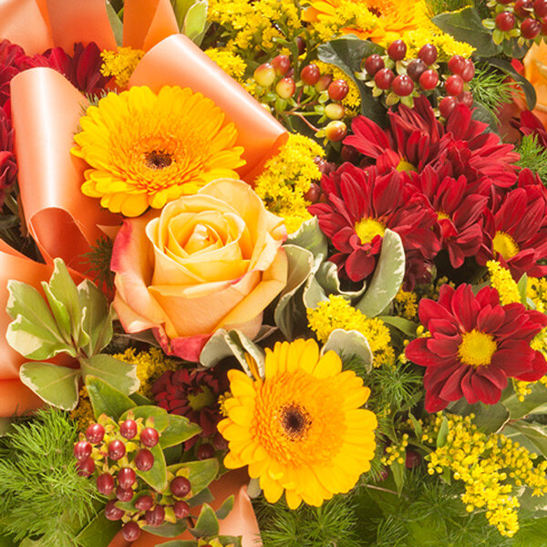 Bouquet rond de deuil dans les tons orange, rouge et vert composé de roses, hypericum, germinis, et autres fleurs de saison accompagné d'un nœud orange.