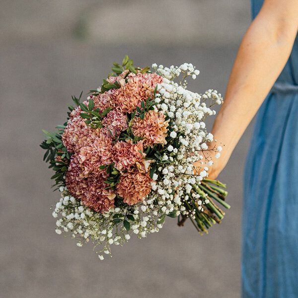 Bouquet dans les tons rouges et blancs composé d'oeillets et de gypsophile.