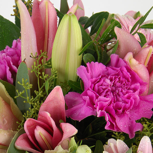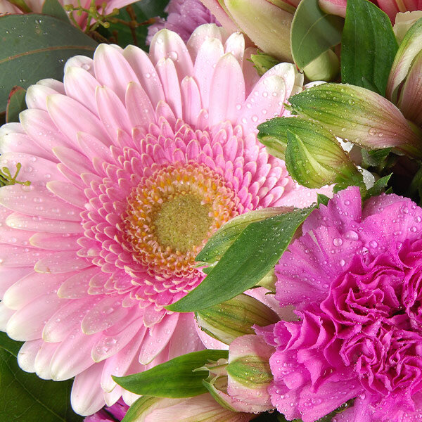 Bouquet dans les tons roses composé de gerberas, alstromerias, oeillets et autres fleurs de saison, le tout accompagné de feuillage et d'un ruban décoratif.