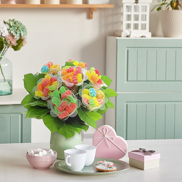Découvrez ces fleurs qui n’en sont pas ! Intégrées dans un joli bouquet de feuillage, des petites boîtes comme autant de fleurs, remplies de délicats bonbons aux différentes saveurs, apportent couleur et fantaisie à ce présent gourmand.
