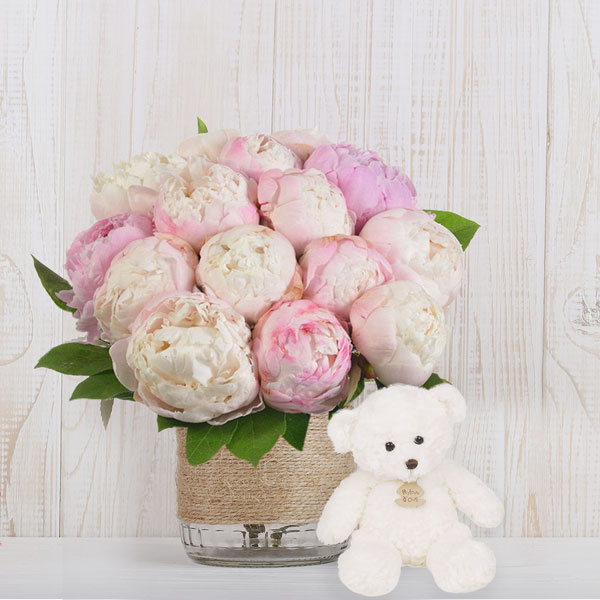 Bouquet de 15 pivoines camaïeu de roses. (la couleur des pivoines peut varier en fonction des arrivages) accompagné d'un ourson en peluche blanc de fabrication française signé Histoire d'Ours. Taille de l'ourson : 20 cm.