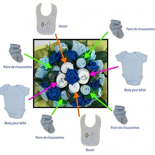 Cadeau drôle et anticonformiste à double effet. Le ravissement devant les fleurs au bleu profond, puis la joie de la découverte des bodys, bavoirs et chaussettes d’excellente facture blottis dans le bouquet.