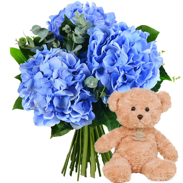 Bouquet composé de trois têtes d'hortensias bleu avec du feuillages, accompagné d'un ourson en peluche marron de fabrication française signé Histoire d'Ours. Taille de l'ourson : 15 cm.
