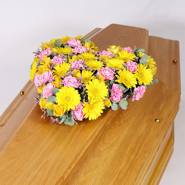 Cœur de deuil dans les tons jaune, rose et mauve, composé d’œillets, de germinis, de roses et de feuillage.
