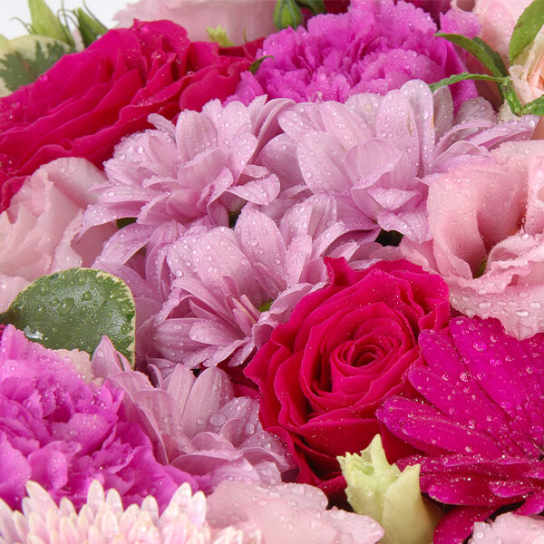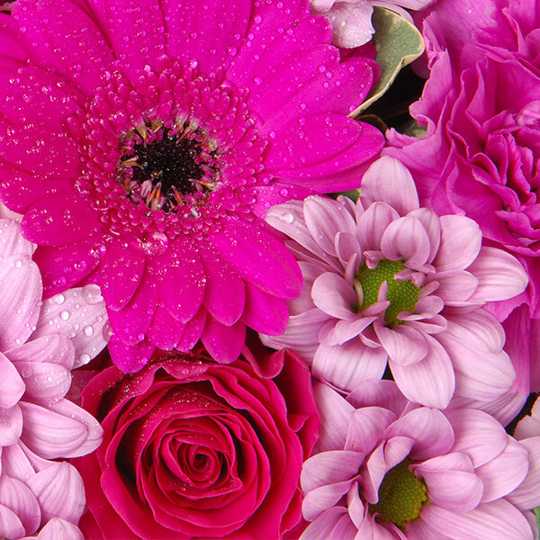 Composition piquée en forme de coeur dans un camaïeu de rose composée d'oeillets, de germinis, de roses et autres fleurs de saison.