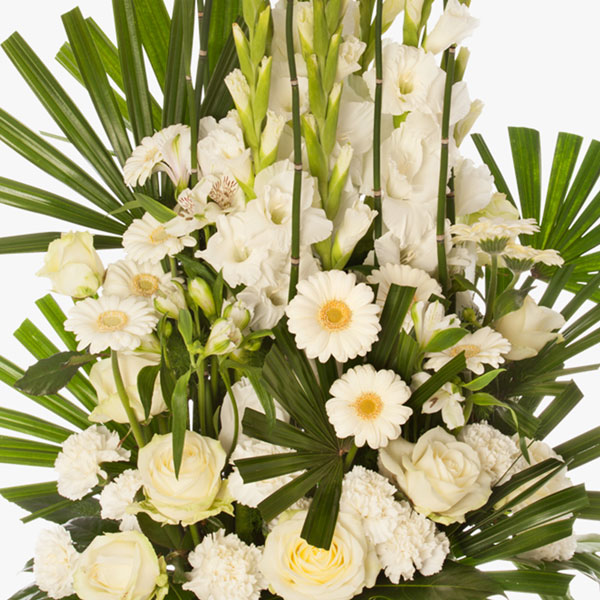 Cette magnifique composition doit son côté exotique à l’habile travail de son feuillage servant de faire-valoir aux végétaux. Nous aimons son graphisme et l’élégance de ses essences monochromes, ici déclinée en blanc pur (symbole d’innocence) cette composition peut être exécutée en rouge, rose, rouge ou orange suivant le message que vous souhaitez faire passer.