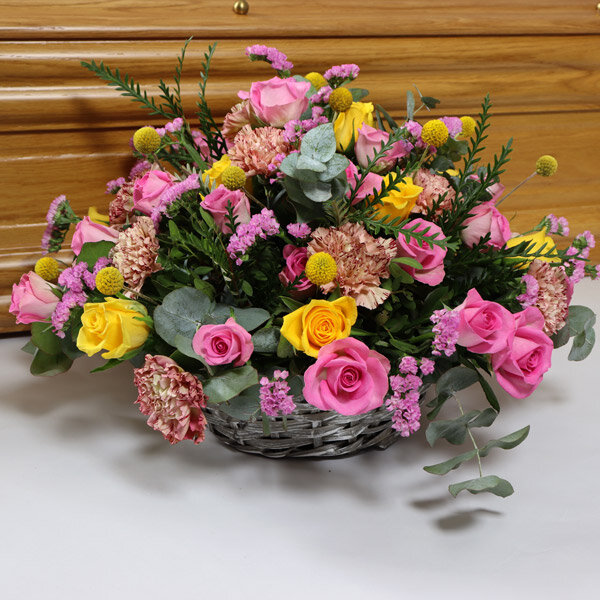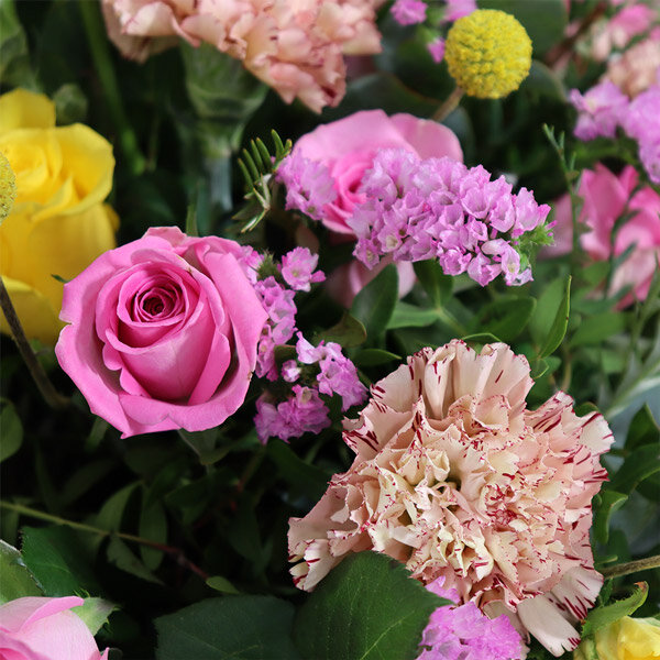 Composition florale dans les tons roses et jaunes composée de roses, oeillets, fleurettes et feuillages. Le contenant peut varier en fonction des disponibilités du fleuriste en charge de votre commande.