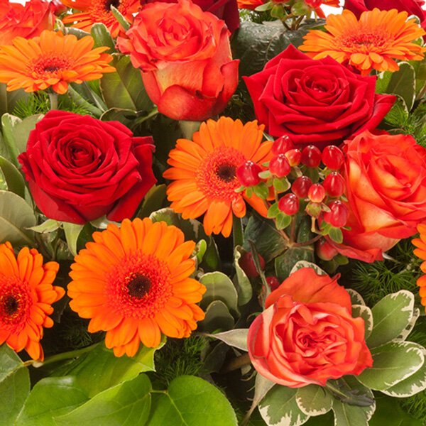 Grande composition de deuil dans les tons rouge, orange foncé et vert composée de germinis, roses et d'autres fleurs de saison dans une vannerie sans anse (contenant non contractuel).