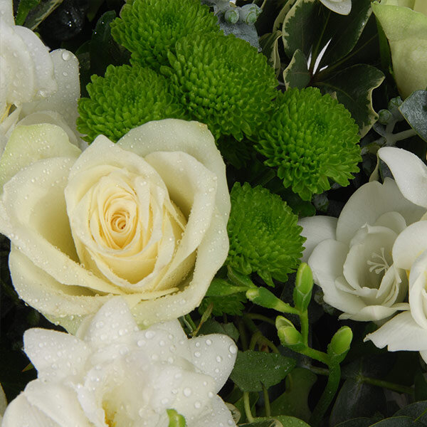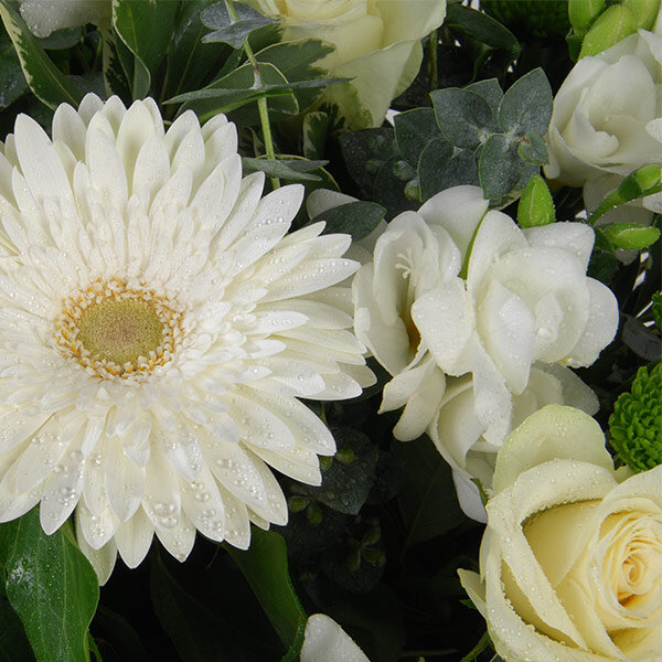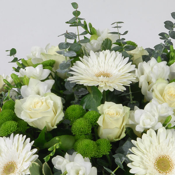 Panier de deuil dans les tons blanc et vert composé de gerberas, roses et freesias le tout accompagné de feuillage et de son panier. (le contenant peut varier en fonction de la disponibilité du fleuriste en charge de votre commande. )