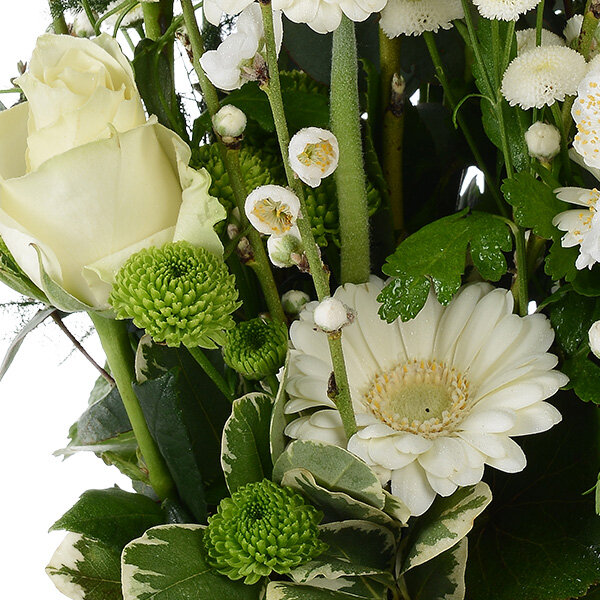 Ce joli panier paysager est composé de fleurs en camaïeu de blanc pur et de feuillage destructuré qui donnent un brin de folie à cette composition florale. Véritable cocon de douceur, ce bouquet apporte une touche de romantisme à votre attention.