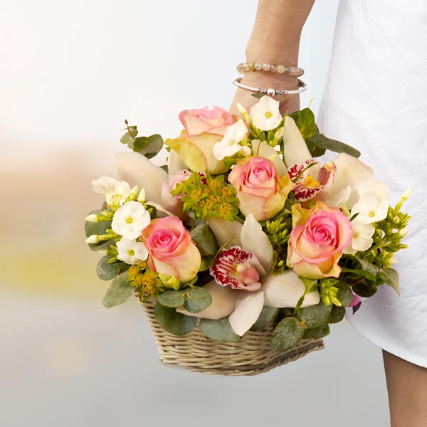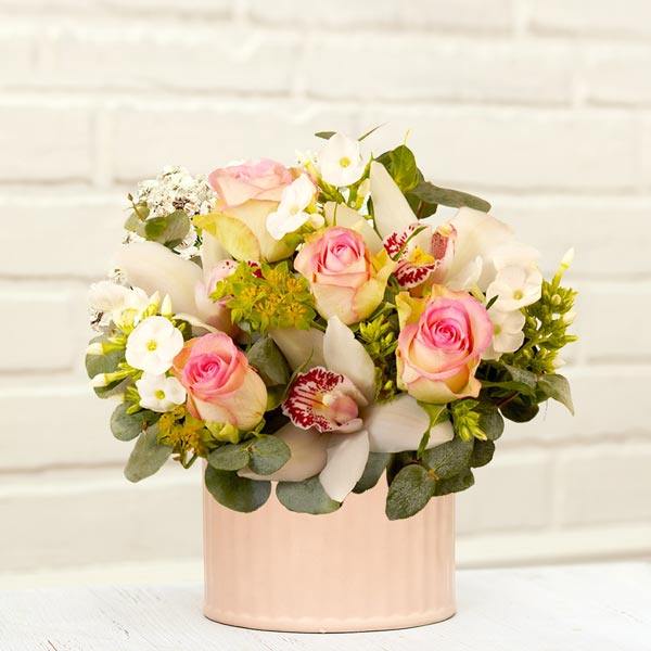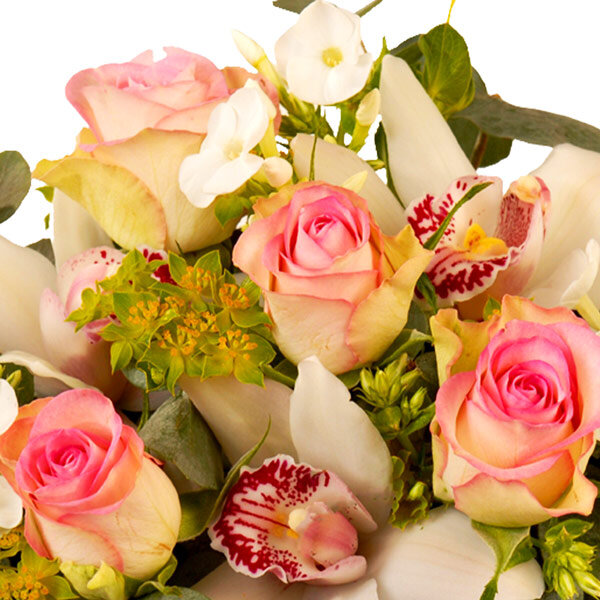 Orchidées et roses tendres prêtent charme et distinction à cette composition piquée qui sera le porte parole magistral de vos sentiments les plus sincères. Sans aucun doute LA composition tendresse !