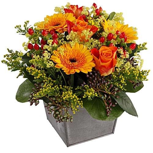 Composition florale dans un contenant carré, dans les tons orange et rouge composée de roses oranges, hypericum, germinis oranges, solidago, alchemille et feuillage (le contenant peut varier en fonction des disponibilités chez le fleuriste).