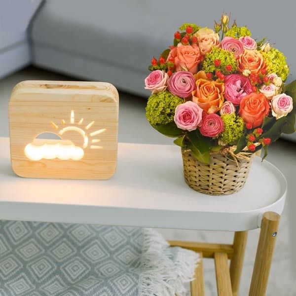 Dans leur joli contenant, les roses orangées rythment cette magnifique composition, harmonieux mélange de teintes délicates et tendres. Cette composition pimpante nous parle de renouveau et de promenade en forêt.