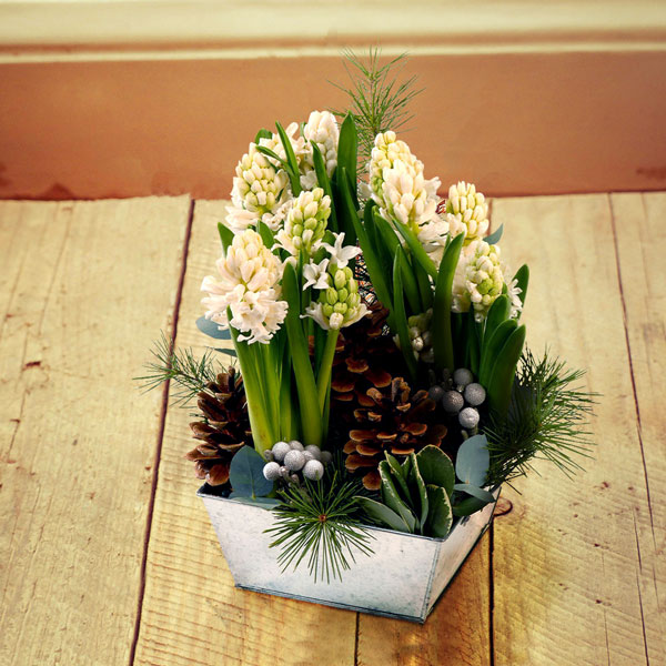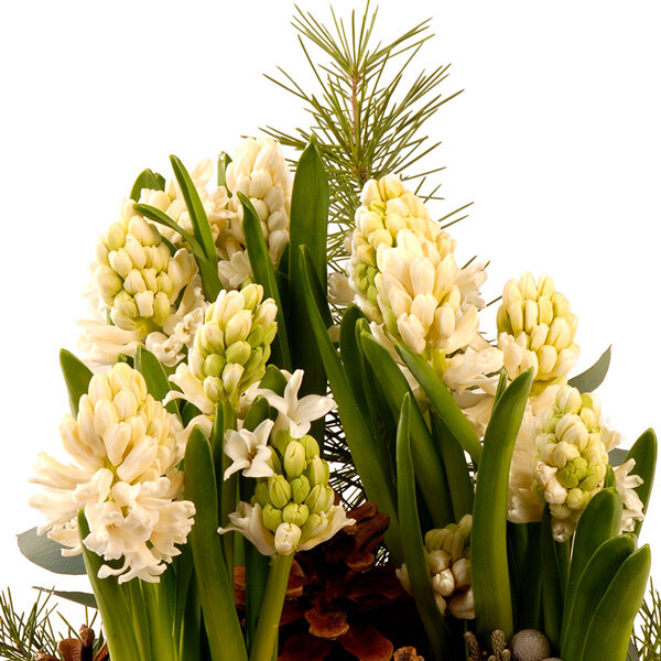Composition de Noël dans les tons blancs et verts composée de jacinthes, silver brunia, sapin et pommes de pin le tout accompagné de son contenant. Le contenant peut varier en fonction de la disponibilité du fleuriste en charge de votre commande.