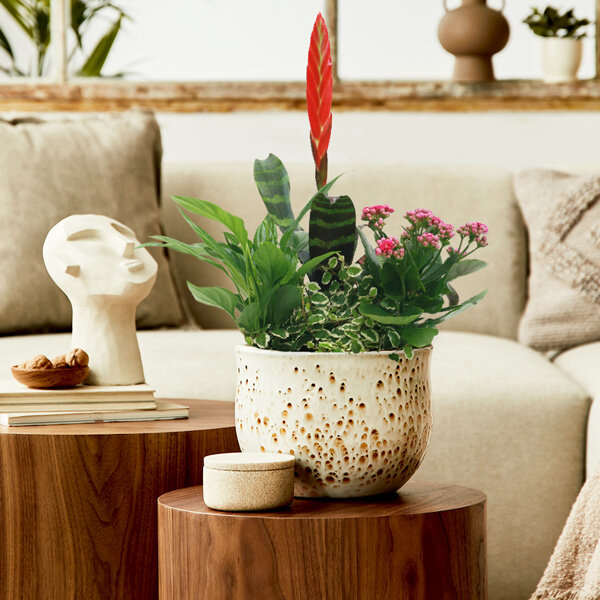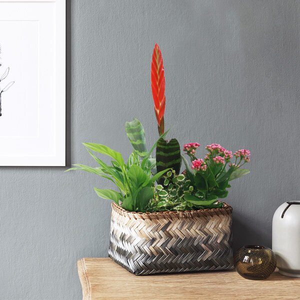 Les kalanchoés aux fleurs roses se marient parfaitement avec le bromélia rouge qui structure cette belle coupe de plantes. La crête du bromélia donne du caractère à l'ensemble et crée un joli contraste avec les autres végétaux. Cette composition dans son contenant rectangulaire ( à noter que le contenant peut varier en fonction de l'arrivage chez le fleuriste en charge de la commande) apporte de la couleur pour longtemps. Les plantes s'enracinent bien et demandent peu d'entretien, ce qui en fait un cadeau durable et décoratif qui encre la nature dans votre intérieur pour longtemps.