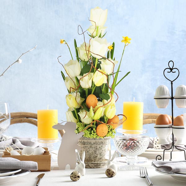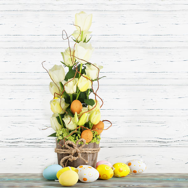 Nos fleuristes ont dissimulé quelques œufs au cœur de cette élégante composition aux tulipes immaculées. Ode à la renaissance et aux beaux jours, Galinea fait entrer le printemps dans les intérieurs encore engourdis par l’hiver.