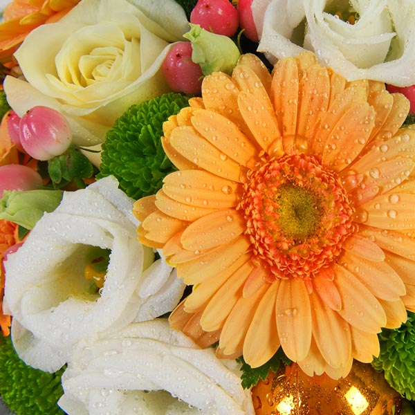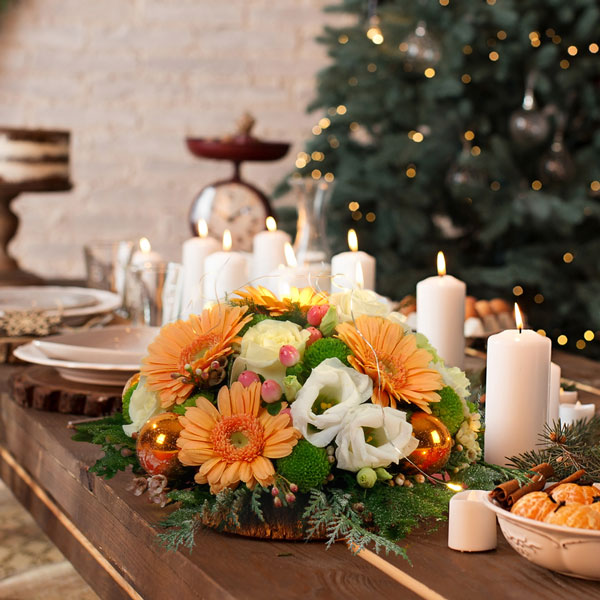 Centre de table de Noël dans les tons orange et blancs composé de gerberas et lisianthus, le tout accompagné de feuillage.