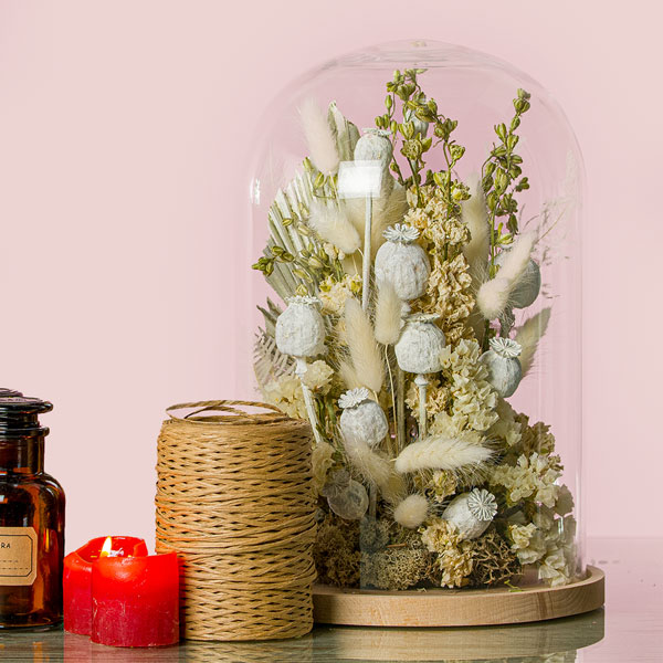 Sous sa cloche de verre se dissimule un petit brin de nature tel un jardin bohème en pleine ville. Découvrez en exclusivité cet ensemble de fleurs séchées dans les tons blanc et beige délicatement assemblé par les artisans fleuristes Florajet. Pour offrir ou pour décorer, laissez-vous tenter par notre magnifique collection de fleurs séchées !