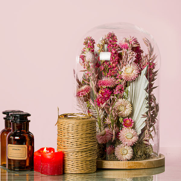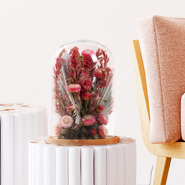Aussi délicieuse à regarder qu’une friandise, découvrez en exclusivité notre petite nouveauté de la collection fleurs séchées. Composée d’un mélange de végétaux, cette précieuse composition vous sera livrée sous sa cloche de verre reposant sur son socle en bois. Un objet déco à mettre dans tous les intérieurs !