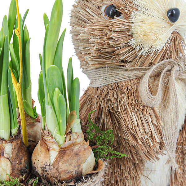 Composition de Pâques composée de bulbes de jonquilles dans leur pot en jute ainsi que d'un lapin en paille.