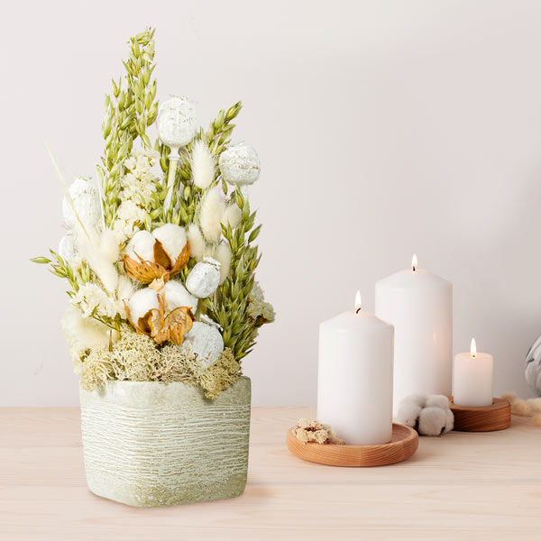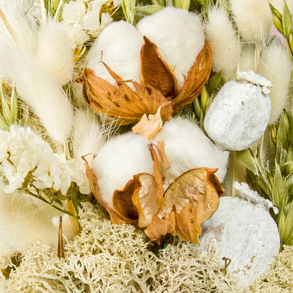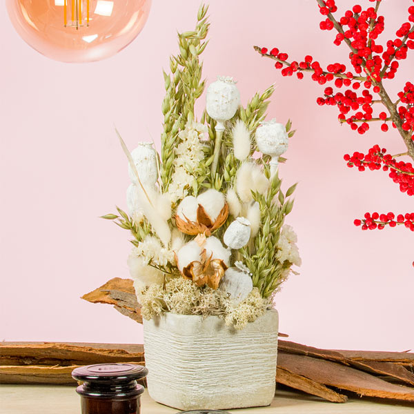 Subtile ode à l'éternité, cette composition à l’architecture harmonieuse est beaucoup plus que la somme des éléments qui la composent. Savante alchimie de fleurs séchées, elle apportera quiétude et bien être à tous les intérieurs.