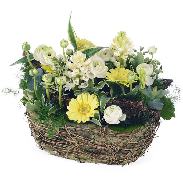 Composition piquée dans les tons jaune et blanc composée de germinis, jacinthes et diverses fleurettes de saison, accompagnées de feuillages variés, le tout présenté dans un joli contenant assorti.