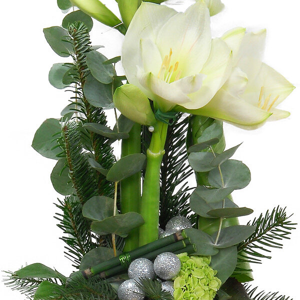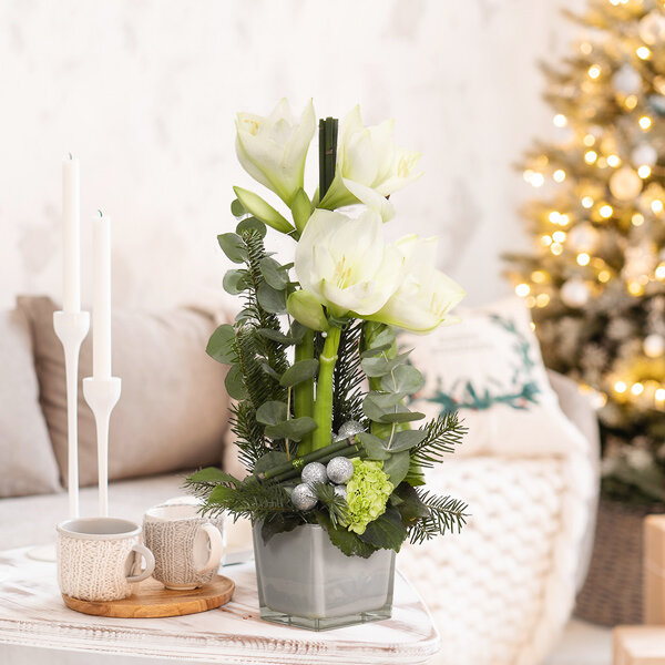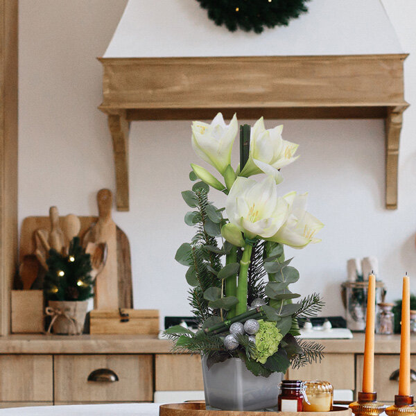 Piquée dans son lit de mousse, cette composition joue sur la verticalité des Amaryllis, fleurs de noël par excellence. Élégante et racée, elle habillera votre intérieur d’une ambiance magique pendant toute la période festive. Si vous êtes conviés à festoyer avec votre famille ou vos amis durant cette scintillante période, optez pour notre composition Elfie, qui séduira votre destinataire.