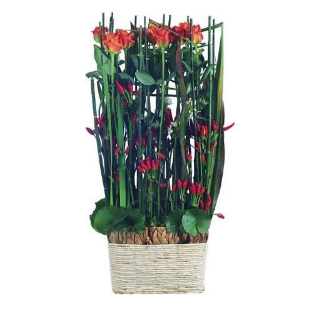 Cette composition allie fraîcheur et richesse florale à la rigueur des lignes crées par les végétaux. Réalisation qui honore ceux qui la reçoive par son élégance et sa forme originale