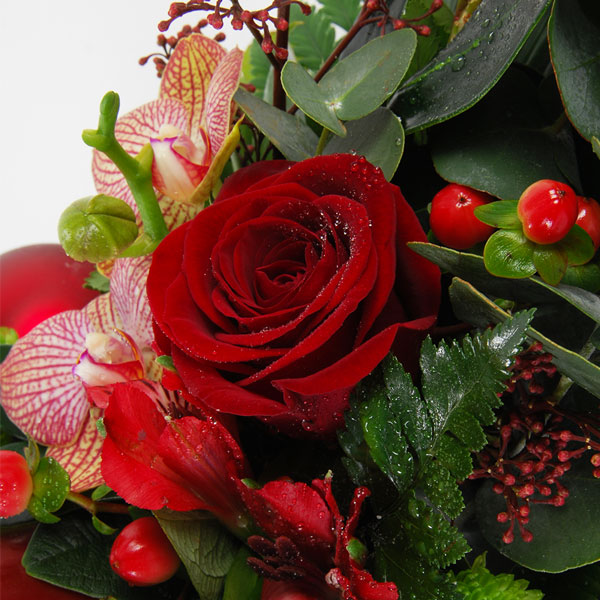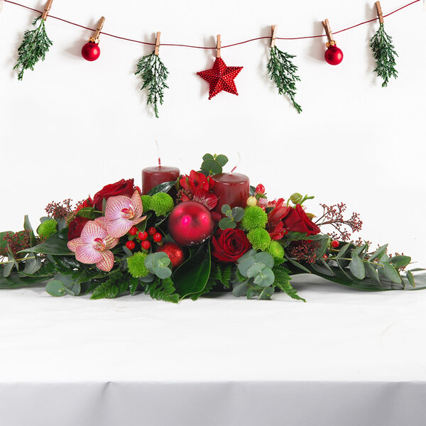 Composition piquée de Noël allongée dans les tons rouge, rose et vert, composée d'orchidées vanda, roses, alstromerias, santinis, boule de noel et bougies, le tout accompagné de feuillage.
