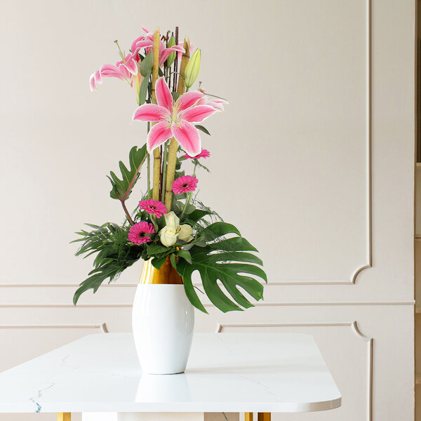 Éventail est une composition florale fière et envoûtante qui incarne la beauté féminine dans toute sa splendeur. La présentation en pyramide de cette création florale fraîche et altière est accentuée par l'arôme suave de ses lys qui embaument l'air. C'est une création élégante et sensuelle, adaptée à toutes les occasions.