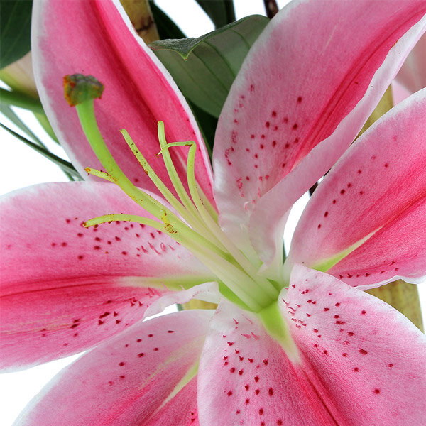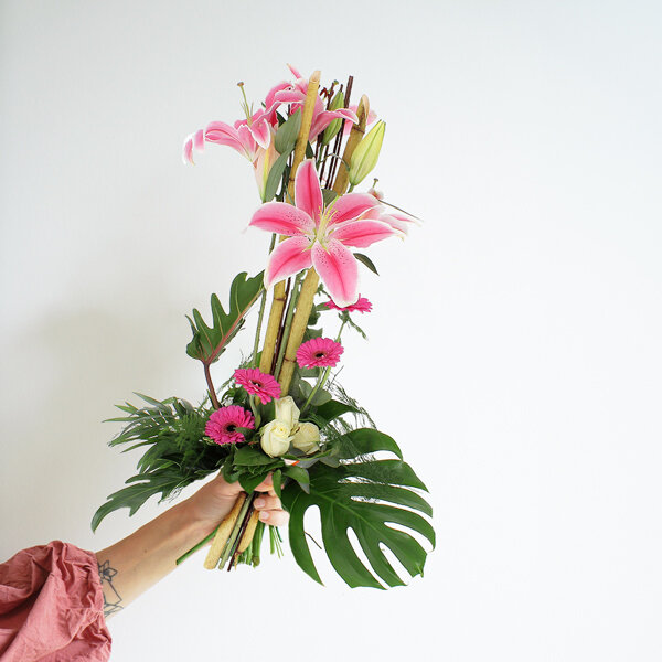 Bouquet longues tiges dans les tons rose, blanc et vert composé de roses, lys, gerberas et feuillages.