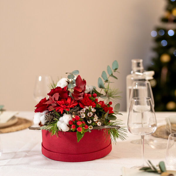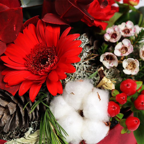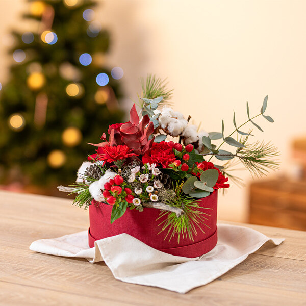 Composition de Noël dans les tons rouges et blancs composée de roses, fleurs de coton, décorations de Noël, fleurettes et feuillages. Le contenant peut varier en fonction des disponibilités du fleuriste en charge de votre commande.
