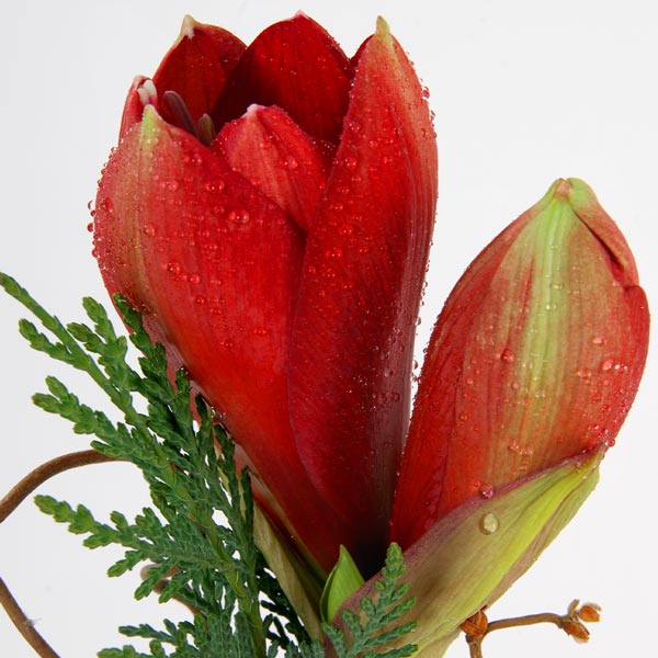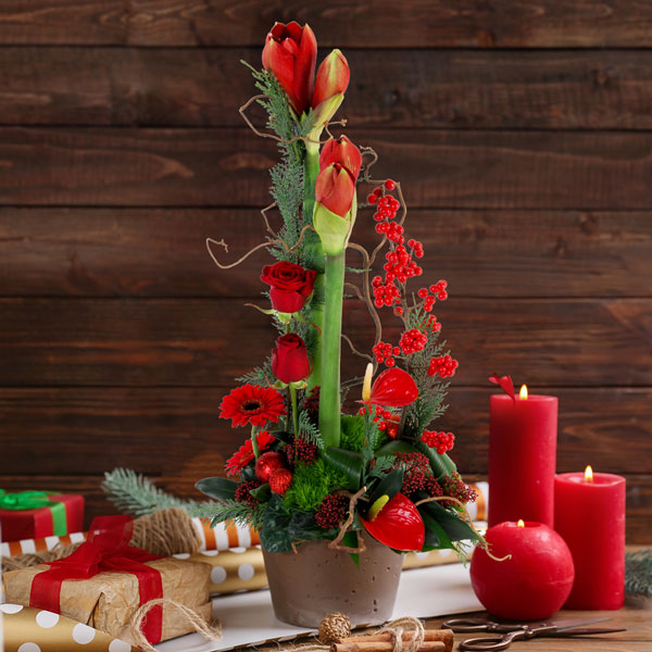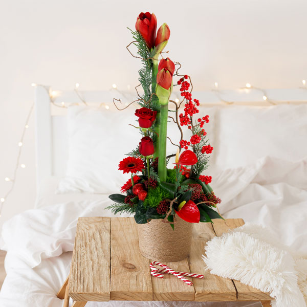 Composition de Noël dans les tons rouges composée d'amaryllis, de roses et de baies de Noël. Le contenant peut varier en fonction des disponibilités du fleuriste en charge de votre commande.