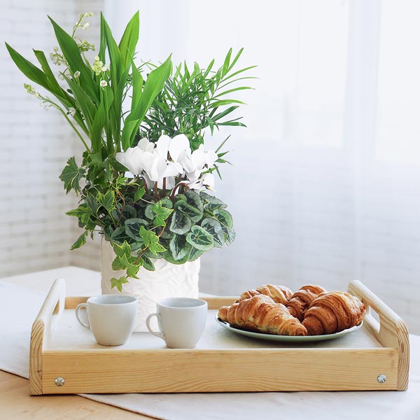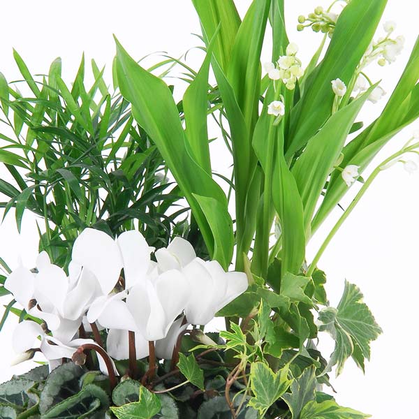 Composition dans les tons de blanc réalisée à partir de cyclamen (peut être remplacé en fonction des disponibilités chez le fleuriste), muguet en racines et autres petites plantes vertes.