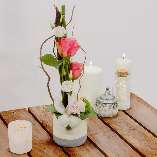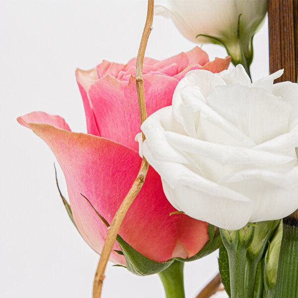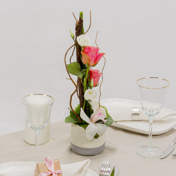 Composition en hauteur dans les tons rose et blanc composée de roses , lisianthus et fleurettes accompagné de feuillage, le tout dans un contenant rond.