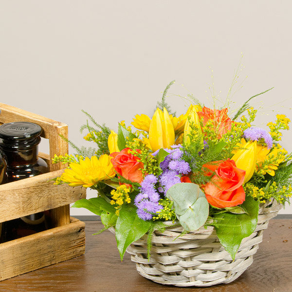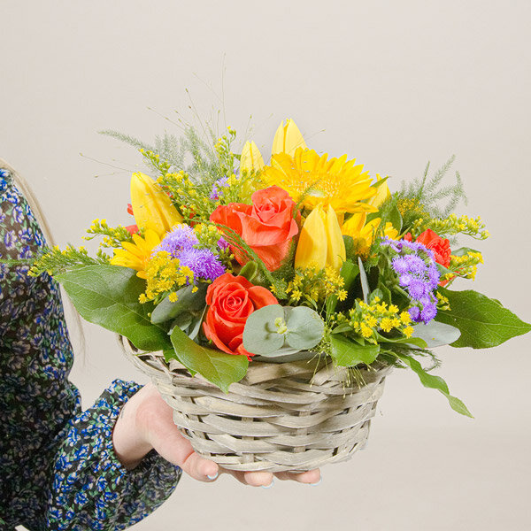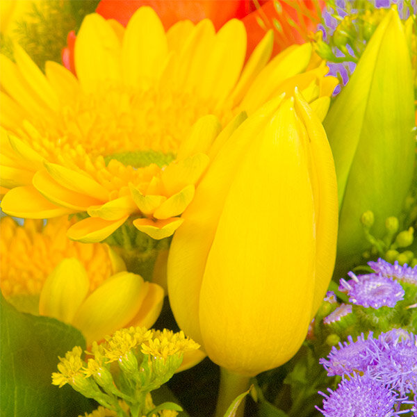 Composition dans les tons jaune, violet et orange composée de roses, germinis, tulipes et autres fleurs de saison, le tout accompagné de feuillage. Le contenant peut varier en fonction des disponibilités du fleuriste en charge de votre commande.