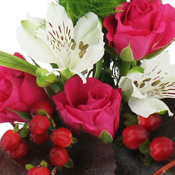 Profitez de la féminité exacerbée de cette composition piquée travaillée toute en tendresse et délicatesse. Roses fuchsia et alstromérias diaphanes sont les bases de ce bel ouvrage dont les brins de muguet porte-bonheur s'élèvent comme autant d'étincelles parfumées. Une composition précieuse à offrir comme un bijou.