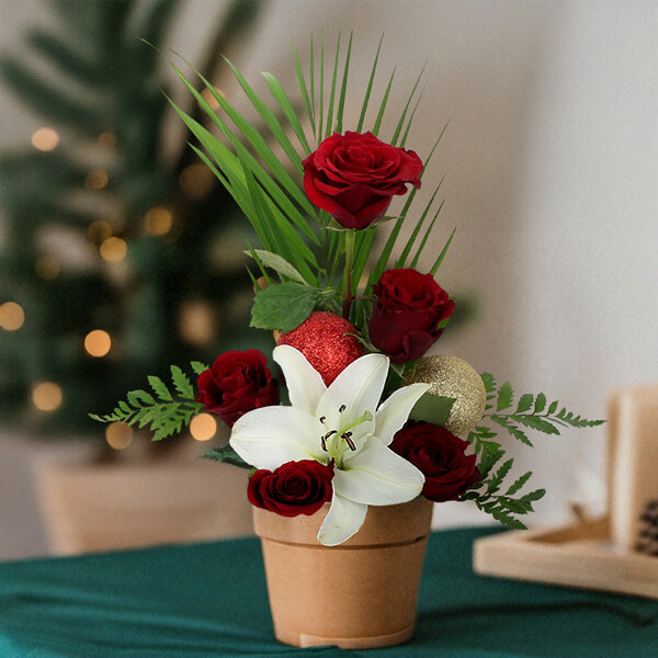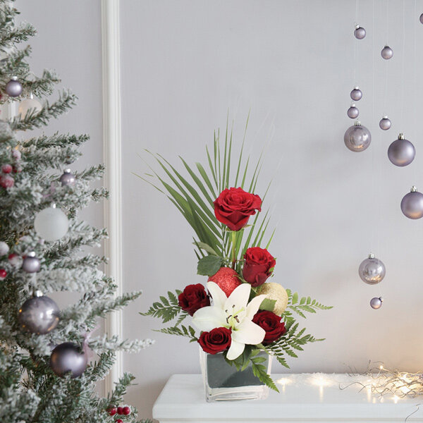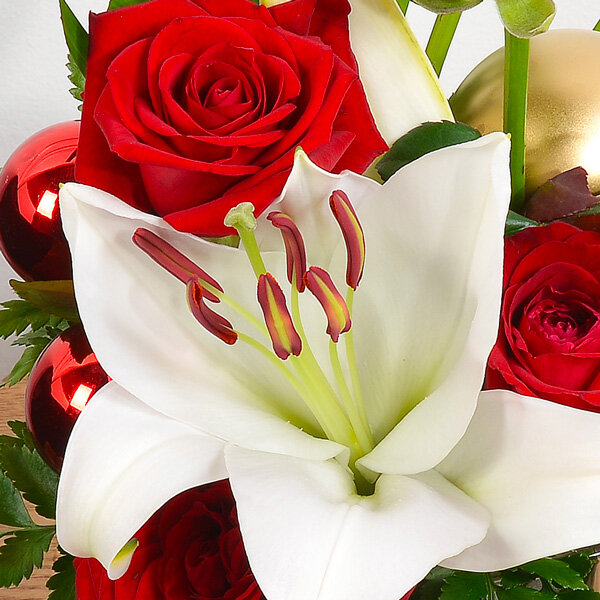 Composition de Noël dans les tons rouge et blanc composée d'un lys, de roses, de feuillage et de boule de Noël . Le contenant peut varier en fonction de la disponibilité du fleuriste en charge de votre commande.