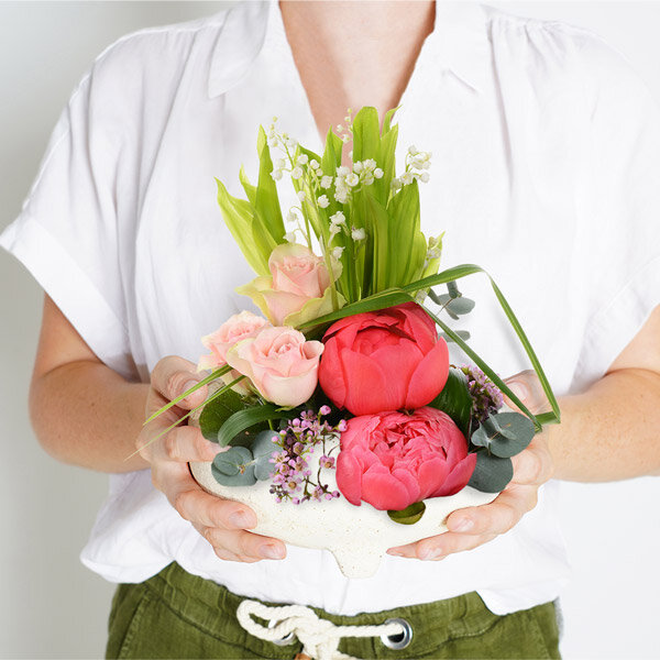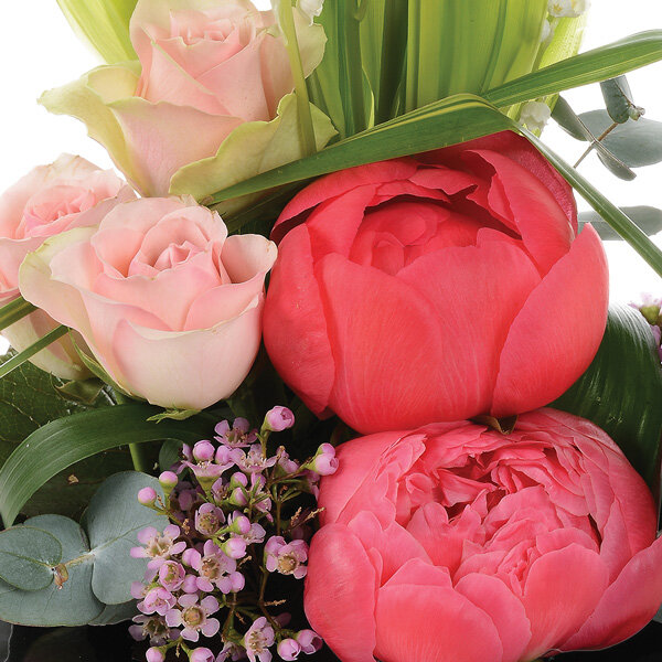 Composition basse dans les tons rose et blanc, composée de pivoines, roses, wax et muguet, finalisé par des végétaux (le contenant peut varier en fonction des disponibilités. Les pivoines peuvent également être changées par des renoncules).