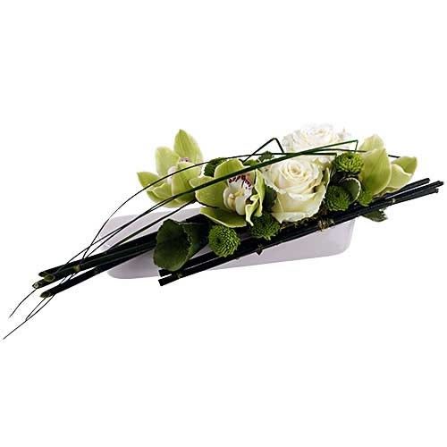 Composition florale dans un contenant rectangulaire, dans les tons de blanc et de vert composée de fleurons de cymbidium (à remplacer en fonction de la disponibilité chez le fleuriste), roses blanches, santinis verts, presle et beergrass.