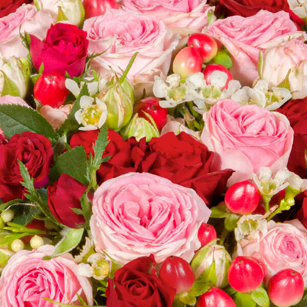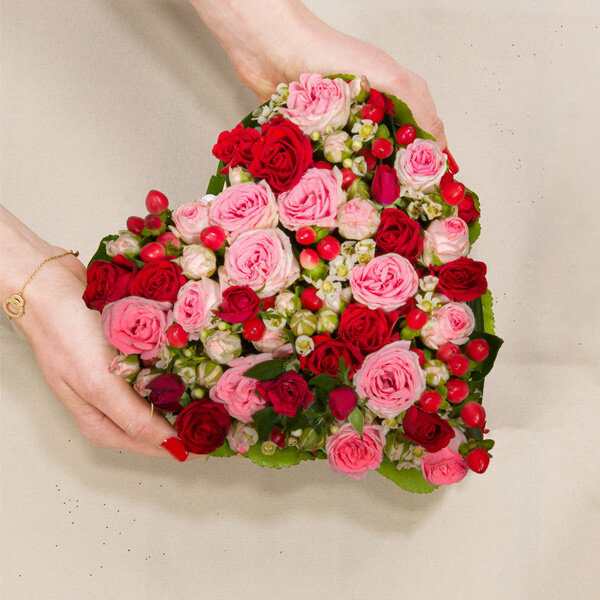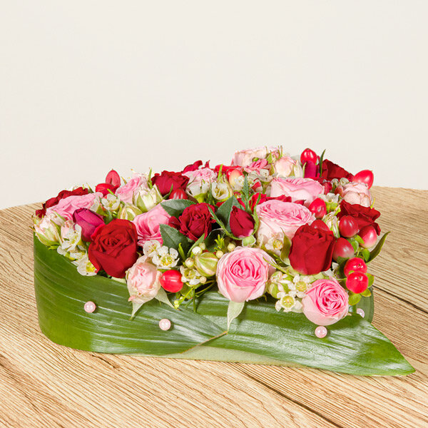Composition piquée en forme de coeur dans les tons rouge et rose composé de roses et fleurettes.