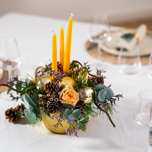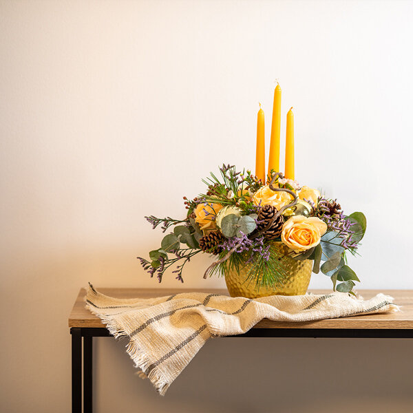 Faites de votre maison un lieu convivial grâce à « Miracle d'Hiver », une composition florale qui procurera du réconfort et du bonheur. Ses teintes orangées rappellent la chaleur douce d'un feu de cheminée, instaurant une ambiance chaleureuse. Les pommes de pin, emblèmes d'authenticité, se mêlent parfaitement aux autres éléments pour créer un équilibre idéal entre la chaleur et la nature. L'ensemble est illuminé par des bougies discrètement incorporées, apportant une note personnelle et joyeuse. Cette création est parfaite pour orner votre domicile et célébrer les instants passés en famille.