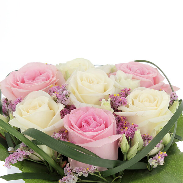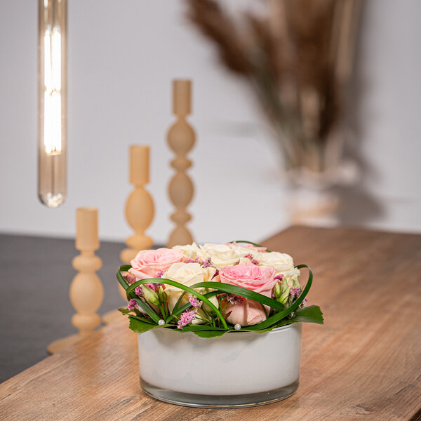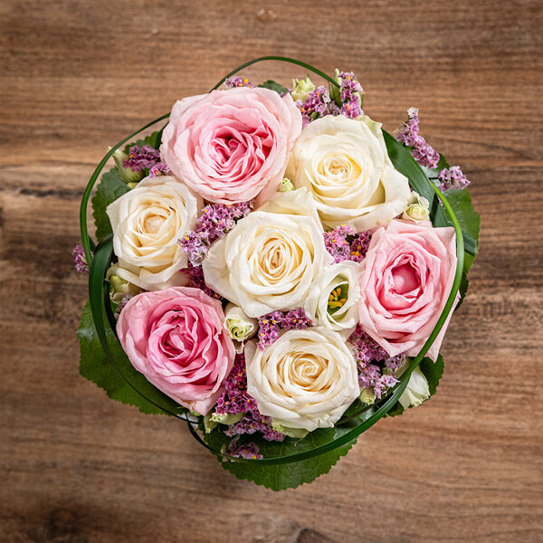 Composition piquée dans les tons pastel composée de roses, lysianthus et autres fleurs de saison. Le contenant varie en fonction des disponibilités de votre artisan fleuriste.