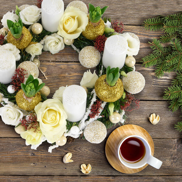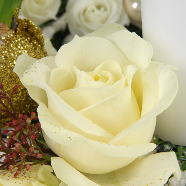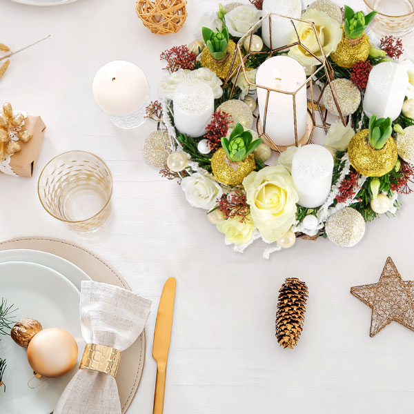Couronne de noël dans les tons doré et blanc, composé de bulbes de jacinthe, lysianthus, roses, bougies et boules de noël.