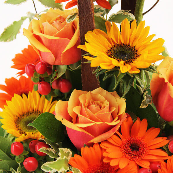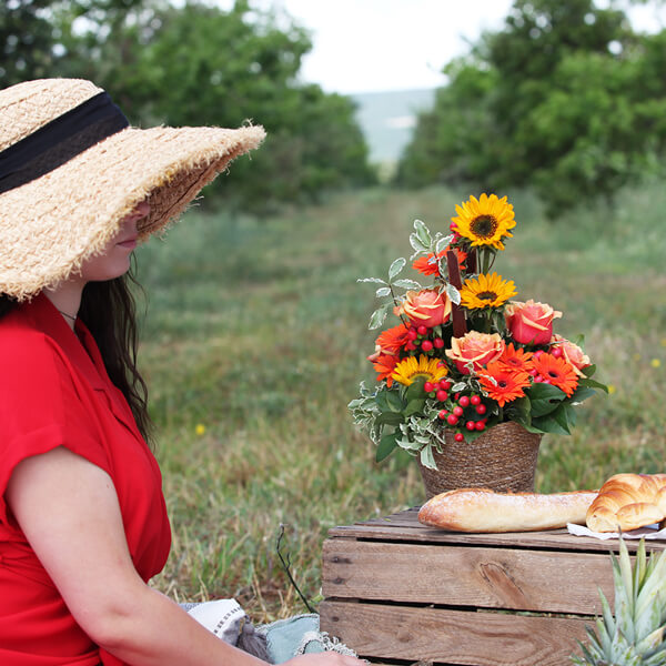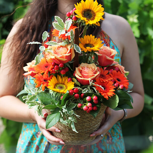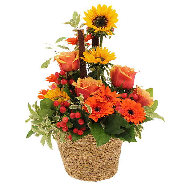 Composition piquée dans les tons jaune et orange composée de tournesols (selon saison), germinis orange, roses orange petits boutons et autres fleurs dans un contenant en osier marron foncé de forme ronde (le contenant peut varier en fonction des disponibilités).