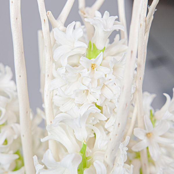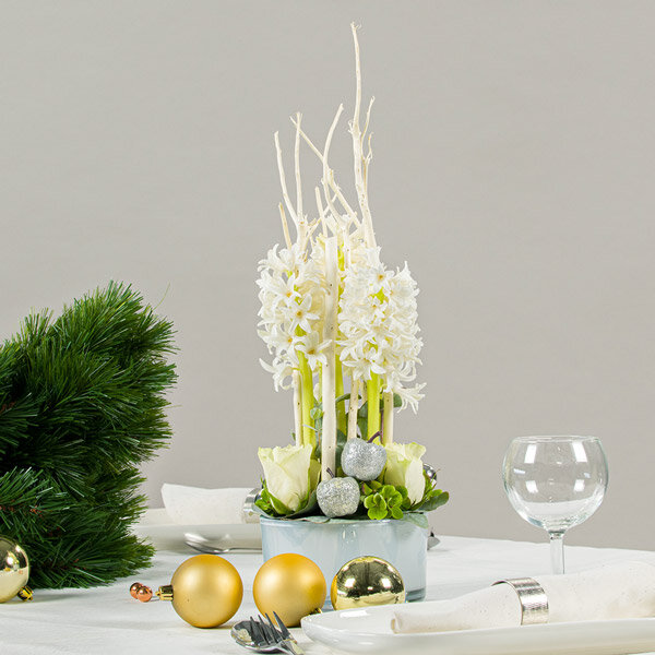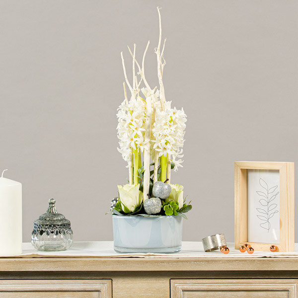 Composition de Noël dans les tons blancs composée de jacinthes, fleurs de saison et décorations de Noël. Le contenant peut varier en fonction des disponibilités du fleuriste en charge de votre commande.