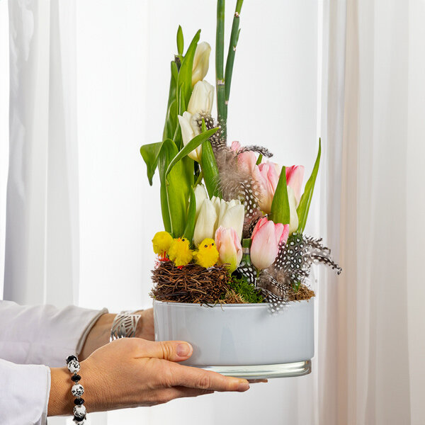 Les cloches résonneront prochainement pour annoncer les festivités de Pâques. Pour cette heureuse occasion, nos artisans fleuristes ont créé avec une attention particulière la composition de Pâques Polito, une œuvre exclusive empreinte de délicatesse, parée de couleurs chatoyantes et de décorations festives. Tel un jardin miniature, Polito s'érige comme le cadeau idéal à offrir ou à orner votre table de repas en ce dimanche pascal, ajoutant une touche florale raffinée à cette journée spéciale.