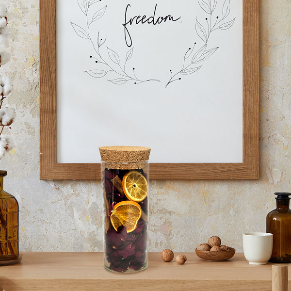 Autour d'un moment cocooning d'hiver, laissez-vous transporter au sein de notre composition de fleurs séchées Cinnamon composé de pétales de roses rouges. Un mélange de senteurs alliant la rose, l'orange et la cannelle délivré au travers d'un pot en verre singulier à disposer sur une table ou sur une commode. Un cadeau parfait en tout occasion pour les amoureux de la décoration.