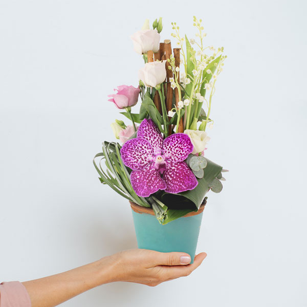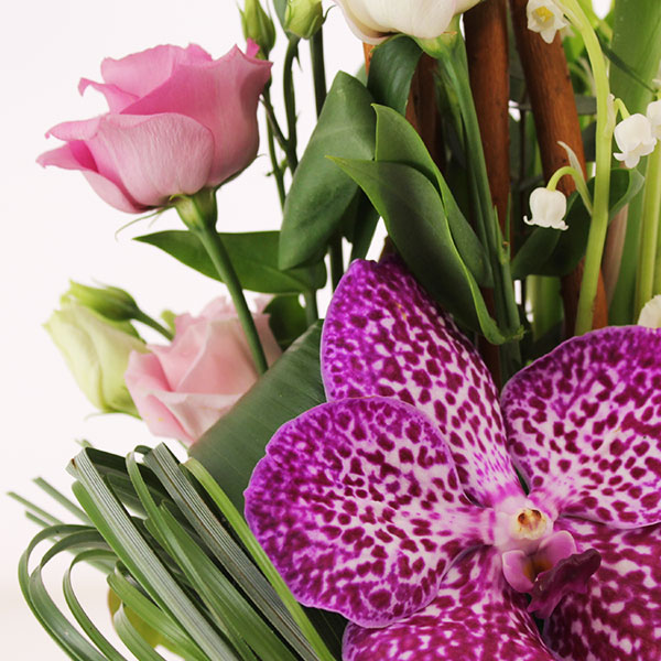Composition florale dans les tons de rose et blanc composée de muguet et autres fleurs de saison dans un contenant. (en fonction des disponibilités, le contenant peut varier ainsi que la variété d'orchidée).